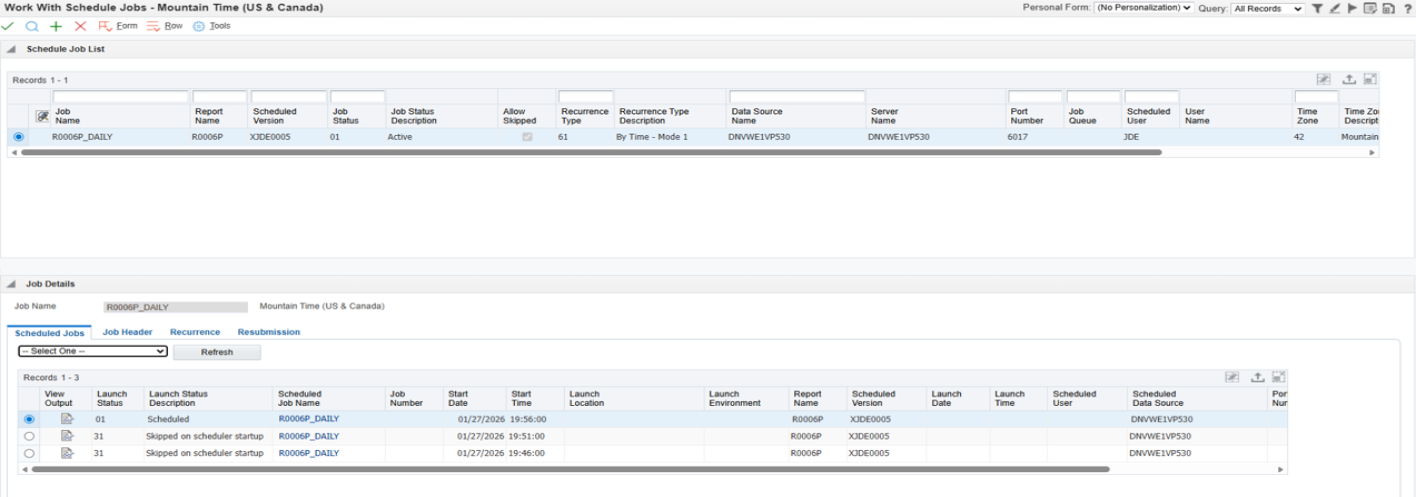 The Job Scheduler (P91300W), now available on the web client in Tools 9.2.26.0, has the same functionality available as on the Windows Development Client, but it is much more efficiently designed and easier to use! As with the original development client Job Scheduler, to begin using you must set up at least one version of P91300W in Interactive Versions such as TEST0001. Once you've created a version, you can Fast Path to "P91300W TEST0001".