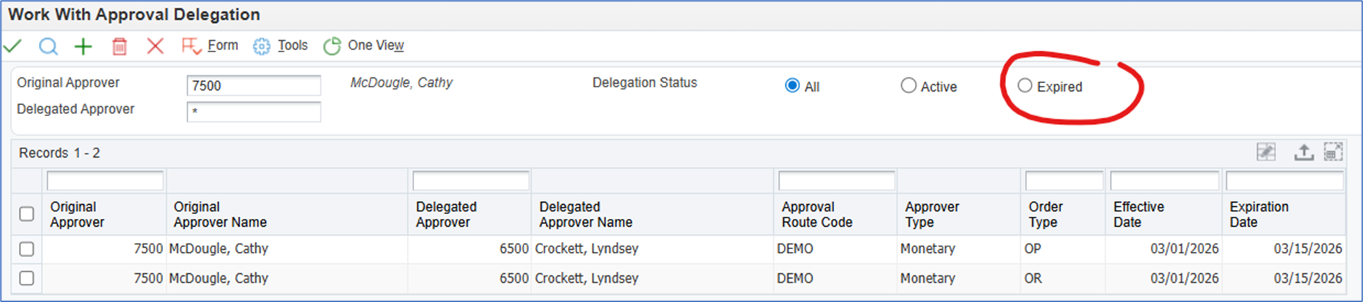We strongly recommend implementing this as soon as you upgrade or even during your upgrade to start capturing this delegation history. You can swap this application (and its new version of it as needed) with any occurrence of P43280 in your system, securing as needed (although it is recommended for *PUBLIC to add Column security to the alias DELFRMID to view only, so end users can't add).