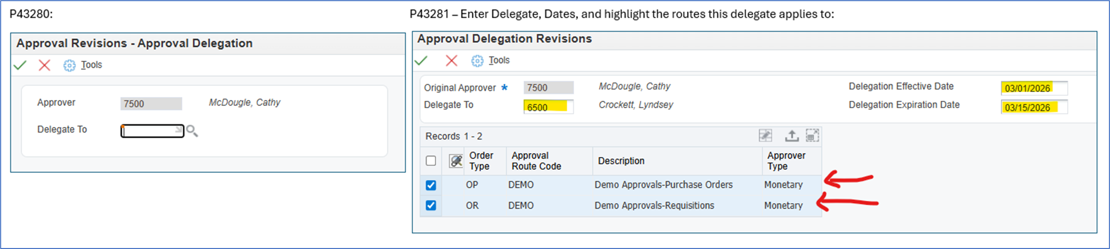 Approval Delegation in the new P43281 application allows delegation with Effective Dates! The old one, P43280, was a delegation you had to then revise once the original approver was back. Now adding the delegate allows you to define the timeframe!