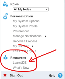 Just click your name in the top-right corner of your JDE session, then select LearnJDE — it’s that easy!
