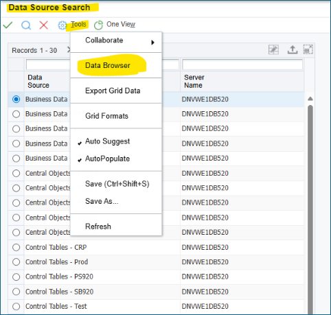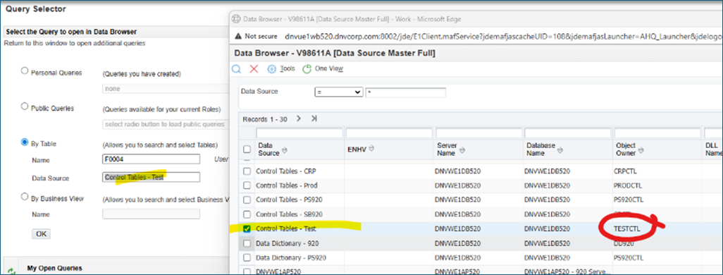 This opens a databrowser tab of the databrowser! I can now see a full list of the named Data Sources with the library 'name' for purposes of SQLing. I was on the hunt for the DV Control Table, and I found it here! It's TESTCTL!