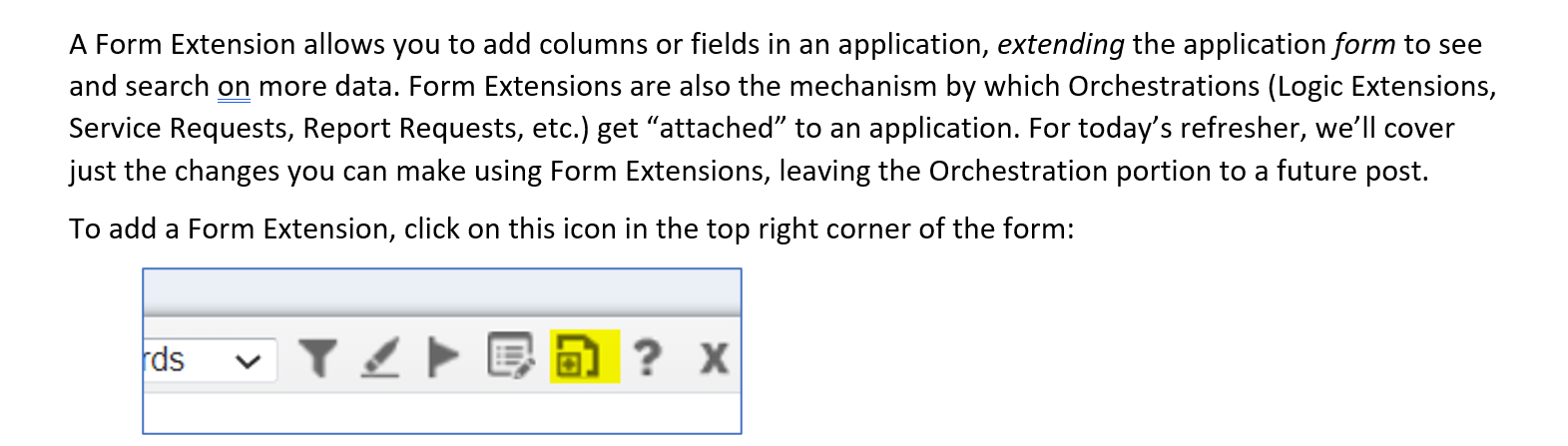 - Unlike with other UDO’s, you only get one Form Extension for the single Application/Form. Saving does not prompt for a Name or Description. (There is an enhancement Bug 28209186 for this, but Form Extensions were designed to only work at the application level.)